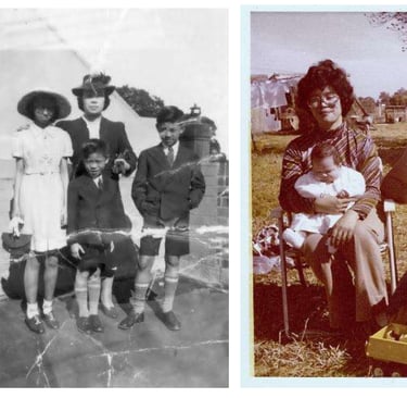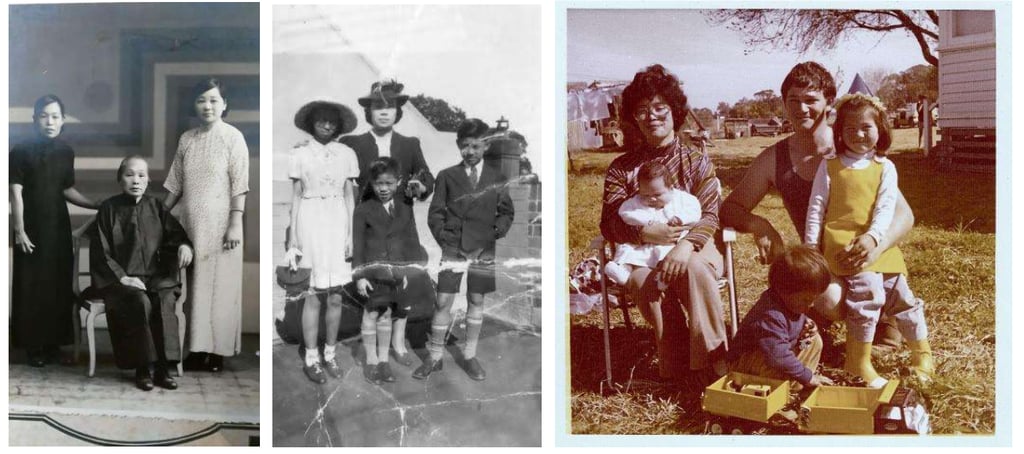 Left: Natives of Guangdong 广东, my great-aunt, great-great-grandmother, and great-grandmother (mother's father’s mother). Early 1900’s. Centre: My great-grandmother (mother’s mother’s mother) with three of her four children in Burwood, Sydney. 1930’s. Right: My mother, me as a baby, my older brother, father and older sister in Corowa, NSW. Note the blue shearer’s singlet and Tonka truck. 1970’s.