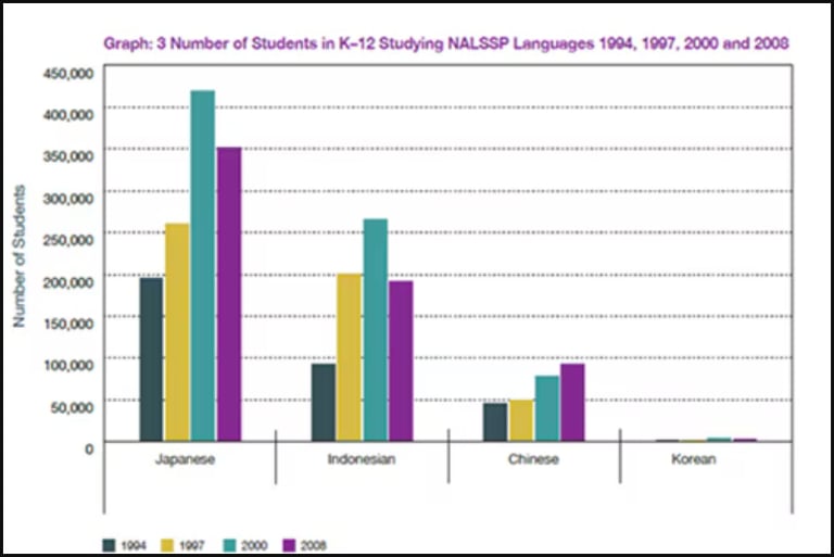 “在1987年,Hawke的政府开展国籍策略提高注册与学亚洲语言。。。这个态度继续在1994年,Keating的政府介绍 NALSAS,学生们学日本语,印尼语,中文的数据剧增了,然后Howard的政府取消NALSAS了。在2008,Rudd的政府尝试更生NALSAS的目标,创作过国籍亚洲语言中学学习课程 (NALSSP). 它的目标是提高流利的亚洲语言学生们在澳大利亚人口数一百分十二了。在2012年,课程的1.2亿块澳洲币金子继续不了." (2)